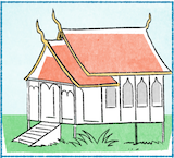 Basic vocabulary — Page 26 — Series B, pictures 01-05: monk, to good to receive food offerings, Buddha statue, temple, stupa
