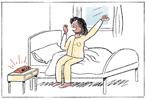 នៅក្នុងរូបភាពទីនៅក្នុងរូបភាពទីនារីម្នាក់នោះបានភ្ញាក់ពីគេង បាទ បានភ្ញាក់ពីគេង ហើយគាត់ក៏អង្គុយនៅលើគ្រែដោយពត់ខ្លួនអញ្ចឹងនារីម្នាក់នោះបានស្លៀកឈុតគេងរបស់គាត់ គឺមានអាវដៃវែងពណ៌លឿង ខោជើងវែងពណ៌លឿងដែរ ហើយគាត់បានងើបចេញពីគ្រែរបស់គាត់ ដោយអម្បាញ់មិញគាត់គេងនៅលើខ្នើយ ឥឡូវនេះគាត់ងើបអង្គុយនៅលើគ្រែ បាទ ហើយគាត់ស្លៀកខោជើងវែងពណ៌លឿង អាវដៃវែងពណ៌លឿងគាត់បានអង្គុយឡើង ហើយលើកដៃមួយចំហៀងឡើងលើ បាទ ដៃមួយខាង ឬក៏ម្ខាង ឬក៏មួយចំហៀង បាទ គាត់លើកឡើងលើ ដៃម្ខាងទៀត គាត់យកមកដាក់ត្រឹមមាត់របស់គាត់ ហើយស្ងាប ហើយគាត់ធ្វើកាយវិការដើម្បីពត់ខ្លួន អញ្ចឹងបន្ទាប់ពីភ្ញាក់ពីគេង ជាទូទៅ យើងតែងតែអង្គុយពត់ខ្លួន ដើម្បីឲ្យថាមានអារម្មណ៍ស្រស់ស្រាយបន្ទាប់ពីភ្ញាក់ពីគេង ដូច្នេះហើយនារីម្នាក់នេះ គាត់កំពុងតែពត់ខ្លួន ហើយនាឡិការបស់គាត់គឺរោទ៍នៅម៉ោងដដែលអញ្ចឹងគាត់ងើបដោយសារតែ […] សំឡេងនៃនាឡិការោទ៍