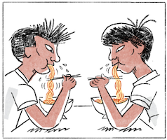បន្ទាប់មកទៀតរូបភាពទី ១៦ នៅក្នុងរូបភាពទី ១៦ បន្ទាប់ពីក្មេងប្រុសទាំងពីរនាក់បានលាយគ្រឿងមីរបស់គេរួចរាល់ហើយ អញ្ចឹងគេលាយគ្រឿងមីរបស់គេរួចរាល់ អញ្ចឹងបានន័យថា ត្រូវនឹងរសជាតិអ្វីដែលគេចង់បានហើយ ពួកគេក៏ចាប់ផ្ដើមញ៉ាំមីទាំងនោះ ដោយក្មេងប្រុសទីគាត់ញ៉ាំមីមានទឹកស៊ុប ចំណែកក្មេងប្រុសទីគាត់ញ៉ាំមីអត់ទឹកស៊ុប ឬក៏មីគោក ហើយយើងឃើញពួកគេទាំងពីរនាក់ គឺប្រើចង្កឹះម្នាក់មួយគូ ដើម្បីចាប់សរសៃមីឡើងញ៉ាំអញ្ចឹងដោយសារតែសរសៃមីវែង ដោយសារតែសរសៃមីវែង ដូច្នេះយើងឃើញគេប្រើចង្កឹះ ហើយមី សរសៃមីនៅក្នុងមាត់ ហើយចុងម្ខាងនៃសរសៃមីគឺនៅក្នុងចានអញ្ចឹងគឺវាពេលខ្លះ ប្រសិនបើយើងអត់ចេះញ៉ាំ គឺពិបាកញ៉ាំណាស់ ដោយសារតែវាវែងពេក អញ្ចឹងពេលខ្លះគេត្រូវប្រើចង្កឹះ ដើម្បីកាត់ផ្ដាច់សរសៃមីឲ្យខ្លី ហើយពេលខ្លះទៀតយើងប្រើធ្មេញ ដើម្បីខាំផ្ដាច់សរសៃមីអញ្ចឹងនៅពេលដែលយើងដាក់សរសៃមីចូលក្នុងមាត់បានខ្លះហើយ យើងប្រើធ្មេញរបស់យើង ដើម្បីខាំសរសៃមីទម្លាក់ចូលក្នុងចានវិញអញ្ចឹងសរសៃមីណាដែលនៅក្រៅមាត់ គឺវាធ្លាក់ចូលទៅក្នុងចាន ចំណែកឯសរសៃមីដែលនៅក្នុងមាត់ គឺយើងទំពាញ៉ាំតែម្ដងដែលជាក់ស្ដែងនៅក្នុងរូបភាពនេះ ក្មេងប្រុសទាំងពីរនាក់ គាត់បានបៀមសរសៃមីនៅក្នុងមាត់របស់គាត់ ហើយប្រើចង្កឹះដើម្បីកាត់សរសៃមីនោះឲ្យខ្លី ដើម្បីងាយស្រួលញ៉ាំ ព្រោះប្រសិនបើយើងអត់កាត់ឲ្យខ្លីទេ យើងអាចស្លាក់បាន អញ្ចឹងនៅពេលដែលមីវែងពេក នៅពេលដែលយើងលេបទៅវាអត់ផុតមាត់ ឬក៏អត់ផុតបំពង់ក ដូច្នេះវាអាចធ្វើឲ្យយើងស្លាក់បាន អញ្ចឹងយើងត្រូវកាត់វាឲ្យខ្លីសិន ដើម្បីងាយស្រួលញ៉ាំ